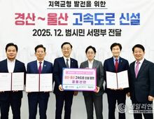 데일리연합 (SNSJTV) 임재현 기자 | 경산시는 17일 국회 본관 소회의실에서 조지연·권영진 국회의원, 조현일 경산시장, 김학홍 경북도 행정부지사, 안효대 울산시 경제부시장 등 관계 지자체 및 국회 관계자 20여 명이 참석한 가운데 경산~울산 고속도로 신설의 국가 계획 반영을 건의하며, 범시민 서명부와 3개 지자체장의 공동선언문을 국토교통부에 공식 전달했다. 이날 경산시는 경산~울산 고속도로 신설을 촉구하는 범시민 서명부(160,123명)와 함께, 경북도·울산시·경산시가 공동으로 뜻을 모은 선언문을 전달하며, 김윤덕 국토부 장관에게 사업의 필요성과 제3차 고속도로 건설계획 반영을 요청했다. 이와 함께 권영진 국회의원도 함께 참석하여 뜻을 모았다. 경산~울산 고속도로는 영남 내륙과 동남권 산업권을 직접 연결하는 핵심 교통축으로, 이동 거리 단축과 물류 효율성 제고를 통해 지역 간 산업 연계 강화와 초광역 경제권 형성에 기여할 것으로 기대되고 있다. 특히 자동차부품 산업이 집적된 경산과 완성차 산업의 중심지인 울산을 직결함으로써, 기존 우회·경유 구조로 인한 물류 비효율을 개선하는 기반이 될 수 있다는 평가다