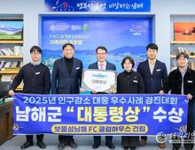 데일리연합 (SNSJTV) 김민제 기자 | 남해군이 행정안전부가 주관한 ‘2025년 지자체 인구감소 대응 우수사례 경진대회’에서 최고 우수 기초지자체로 선정돼 대통령상을 수상하는 영예를 안았다. 남해군은 이번 경진대회에서 ‘지방소멸에 맞서는 남해군의 킥오프, 클럽하우스로 정착을 이끌다.’라는 주제로 보물섬남해FC 클럽하우스 건립사업 사례를 발표해 높은 평가를 받았다. 지자체 인구감소 대응 우수사례 경진대회는 지역 주도의 인구감소 대응 정책 성과를 공유하기 위해 지난 2022년부터 개최되고 있는 행정안전부 주관 경진대회다. 올해는 광역지자체 11건, 기초지자체 77건 등 총 89 건의 우수사례에 대하여 외부 전문가의 1차 심사가 진행됐으며, 그 결과 선정된 13개(광역 3, 기초 10) 우수 사업이 본선에 진출해 광역지자체 부문과 기초지자체 부문으로 나뉘어 심사가 이루어졌다. 대통령상을 수상한 남해군의 ‘보물섬남해FC 클럽하우스 건립사업’은 유소년 스포츠 육성을 중심으로 훈련·생활·학습 환경을 통합적으로 개선하고, 이를 통해 지역 정착과 인구 유입으로 이어지는 구조를 제시한 점이 높은 평가를 받았