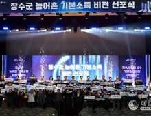 데일리연합 (SNSJTV) 김민제 기자 | 장수군은 8일 한누리전당 산디관에서 ‘농어촌 기본소득 비전 선포식’ 행사가 성황리에 개최됐다고 밝혔다. 이날 행사는 장수군이 농어촌 기본소득 국가 공모사업에 추가 선정된 것을 군민과 함께 축가하고 ‘기본소득을 통해서 꿈을 가꾸는 희망의 도시 장수’라는 기본사회 실현을 위한 비전을 선포하는 의미 있는 자리로 마련됐다. 행사에는 최훈식 장수군수를 비롯해 최한주 군의회 의장과 군의원들, 박용근 전북특별자치도의원, 기관사회단체장, 군민 등 약 900여 명이 참석해 뜨거운 열기를 더했다. 이날 행사에서는 장수 풍물단과 난타 식전 공연을 시작으로 △기본소득 선정 경과보고 △기념사 및 축사 △비전 선포식 △기념 퍼포먼스 등 다양한 프로그램이 진행됐다. 이정우 부군수의 경과보고에서는 농어촌 기본소득 공모 선정 과정과 그동안의 준비 절차, 제도 도입의 필요성, 향후 추진 일정 등 기본소득 시행을 위해 반드시 알아야할 내용을 중심으로 설명이 이루어졌다. 또한 행사장에서는 군민들이 기본소득 선정에 대해 전하는 소감과 기대를 담은 ‘군민의 소리’ 인터뷰 영상이