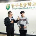 데일리연합 (SNSJTV) 장우혁 기자 | 김동연 경기도지사가 16일 동두천중학교를 찾아 노점 할머니께 비상금을 건넨 선행으로 화제가 된 옥현일 군에게 표창을 수여했다. 김 지사는 학교 현관에서 학생회와 함께 ‘함께라서 더 빛나는 우리’ 생명존중 캠페인에 동참하고, 이어 1층 로비에서 옥현일 군에게 표창장을 전달했다. 옥현일 군은 지난 7월 폭염 속에서 노점상 할머니에게 비상금 3만 원을 건네고 콩 한 봉지를 받은 사연이 알려지며 주목받았다. SNS에 게시된 영상은 인근 공방 운영자가 촬영한 것으로, 현일 군이 남모르게 베푼 선행이 담겨 3일 만에 206만 조회수, ‘좋아요’ 약 7만, 댓글 2,500개 이상을 기록했다. 당시 현일 군은 “더운 날씨에 할머니가 물건을 빨리 팔고 쉬셨으면 좋겠다는 마음이었다”고 말해 많은 시민에게 감동을 줬다. 김동연 지사는 이날 인사말을 통해 “옥현일 군이 도운 할머니가 우리의 어머니, 할머니”라며 “수많은 옥현일 군이 동두천중에 있다고 본다. 그것이 사람 사는 세상”이라고 말했다. 이어 “여러분이 그런 따뜻한 마음을 갖길 바란다. 당장은 남을 위한