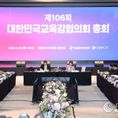 데일리연합 (SNSJTV) 김준 기자 | 대한민국교육감협의회(회장 강은희 대구광역시교육감)는 1월 29일, 경기도 성남시 더블트리바이힐튼서울판교호텔에서 제106회 총회를 개최했다. 이번 총회에서는 전국 시도교육감 및 교육청 관계자, 협의회 사무국 관계자 약 200명이 참석하여 '사립학교의 ‘공직자 이해충돌방지법’ 적용을 위한 법령 개정 건의' 등 5개 안건을 심의·의결했고, '행정통합 추진에 따른 경과 및 쟁점'에 대해 교육의제로 토의했다. 이날 심의 안건은 ▲사립학교의 ‘공직자 이해충돌방지법’ 적용을 위한 법령 개정 건의, ▲외부강의 등 요청 표준서식 마련 요구, ▲‘보호자 협조·동의 관련’ 기초학력 보장법 및 동법 시행령 개정 요청, ▲교육활동 침해 학생의 학적변동 제한을 위한 법률 개정 건의, ▲학습지원 소프트웨어 관련 초·중등교육법 개정 제안으로 모두 5개의 안건을 심의·의결했고, 지난해 12월 11일 실무협의회를 통해 전국 17개 시도교육청의 전원 합의 과정을 거쳤다. 다음으로 2개 교육청에서 우수사례를 발표했는데, ▲(경기) 시·공간 경계를 넘어 세계를 잇는 한국어교육 온라인 경기한국어랭귀지스쿨(K